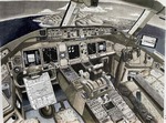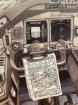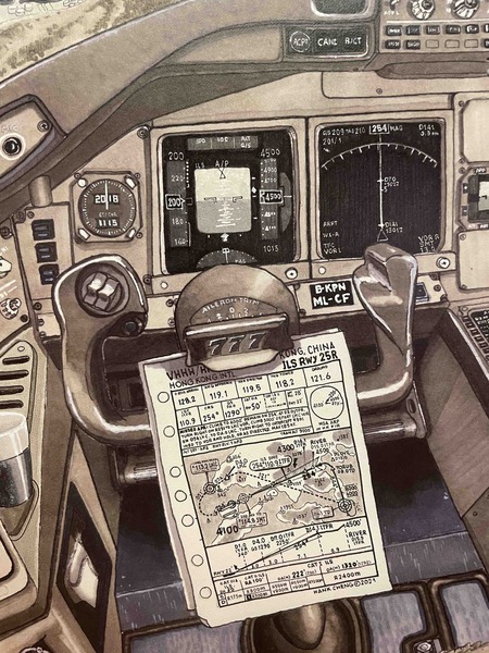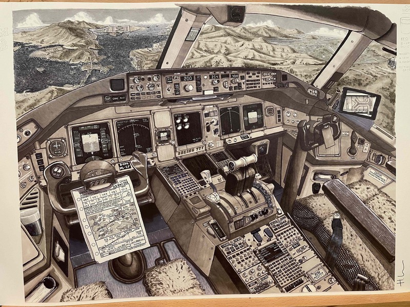 Boeing 777 flight deck illustration. Highly customised outside view, approach chart, instrument panel displays and MCP setting. Signed and limited to 77 prints.